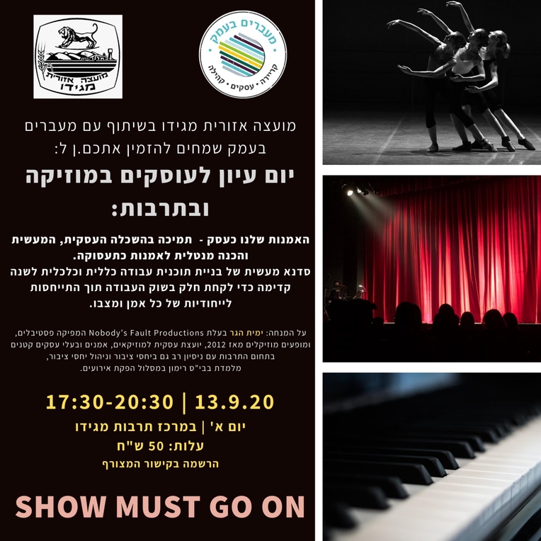 | |  | | יום עיון לעוסקים במוסיקה ובתרבות | | מוזמנים ליום עיון ב13.9.20 יום א' בשעה 17:30-20:30 במרכז תרבות מגידו. היום עיון יעסוק בבנית תוכנית עבודה כללית וכלכלית לשנה