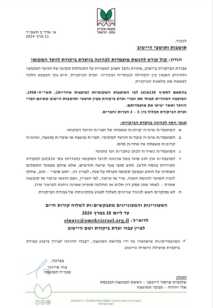 מצ"ב קול קורא לגיוס תושבים המעוניינים לכהן בועדת ביקורת לועד המקומי. מוזמנים להגיש מועמדות עד ה- 28.3.24 למייל המצויין בפרסום המועצה האזורית עמק יזרעאל.