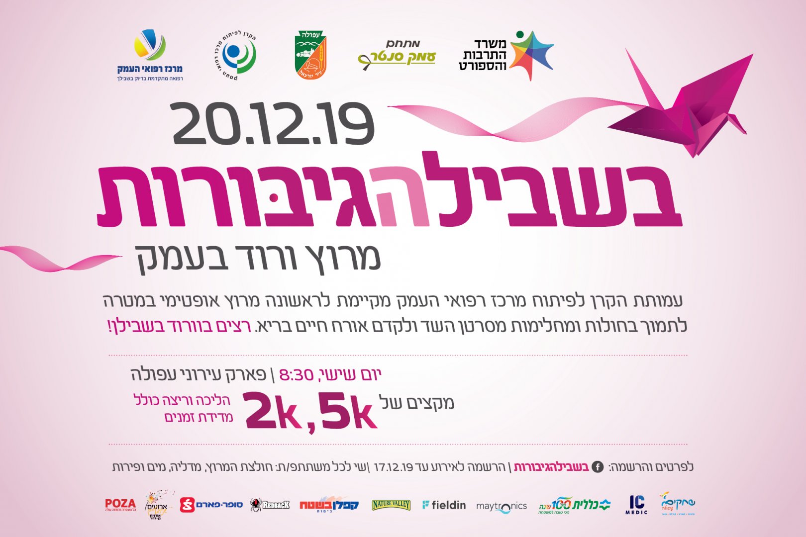 מרוץ בשביל הגיבורות מירוץ "בשביל הגיבורות" מאורגן ע"י אגודת הידידים של בי"ח "העמק" ומטרתו לתמוך בחולות ומחלימות מסרטן השד ולעודד אורח חיים בריא.